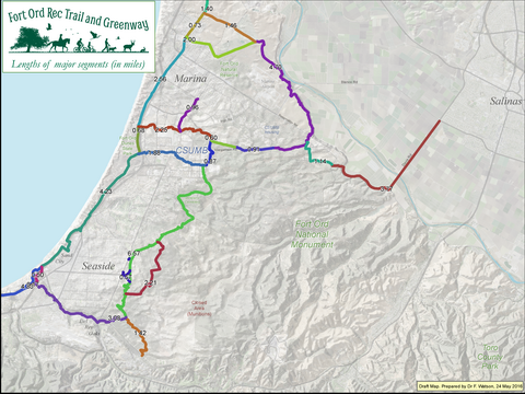There's a few ways to answer this question. The Northern Loop trail is 13.0 miles. The Southern Loop trail is 16.3 miles. The central 'CSUMB' loop is 5.7 miles. If you combine these by connecting directly from 8th & Gigling to Whispering Oaks near CSUMB, you get a single, outer 'grand coastal loop' trail at 26.7 miles, almost all in open space. This includes 7.5 miles of the 'Coastal Rec Trail' that already exist, leaving about 24.3 miles to be constrcuted as part of the 'FORTAG' trunk. This last figure includes a 1.4 mile segment to Ryan Ranch. A number of additional spurs are envisioned to provide connections between local neighborhoods and FORTAG. Ones that we're trying to include as part of the overall FORTAG budget are a 1.0 mile connection along California in Marina, and 0.6 miles of connections in Seaside to Hilby, Broadway, and San Pablo avenues. Everything is subject to change, of course, as plans crystalize.